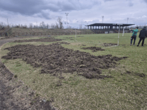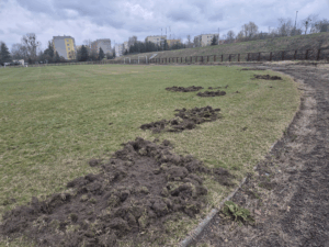 Skutki tego zdarzenia są poważne. Dziki rozorały znaczną część murawy boiska, pozostawiając głębokie bruzdy i uszkodzenia nawierzchni. Zniszczona została także bieżnia, która służy nie tylko zawodnikom sekcji lekkoatletycznej, ale również lokalnym mieszkańcom – dzieciom, młodzieży i seniorom – w ramach ogólnodostępnych zajęć rekreacyjnych. Dodatkowo uszkodzenia ogrodzenia stanowią obecnie zagrożenie dla bezpieczeństwa i umożliwiają kolejne wtargnięcia dzikich zwierząt na teren obiektu.
