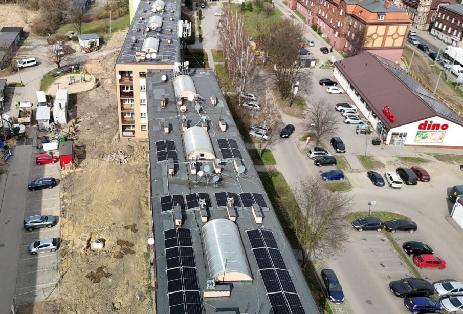 Prace na terenie osiedla idą pełną parą. W ostatnich tygodniach krajobraz przy ul. Ostatniej wzbogacił się o kluczowe elementy nowego systemu: zamontowano już wodny magazyn ciepła, zaawansowany moduł maszynowni pomp ciepła oraz wymiennik powietrzny. To jednak nie koniec zmian widocznych gołym okiem. Na dachach poszczególnych budynków rozpoczął się właśnie montaż paneli fotowoltaicznych, które będą zasilać całą instalację darmową energią ze słońca.
