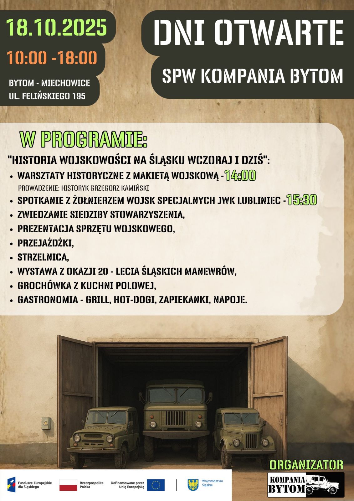 W sobotę, 18 października, od godziny 10:00 do 18:00, przy ul. Felińskiego 195 w Miechowicach odbędzie się Dzień Otwarty, w którego  programie znalazły się pokazy sprzętu wojskowego i pojazdów militarnych, zwiedzanie siedziby stowarzyszenia, warsztaty historyczne z makietą wojskową, wystawa z okazji 20-lecia Śląskich Manewrów oraz spotkanie z żołnierzami wojsk specjalnych JWK Lubliniec. Dla smakoszy przygotowano kuchnię polową oraz wojskową grochówkę.
