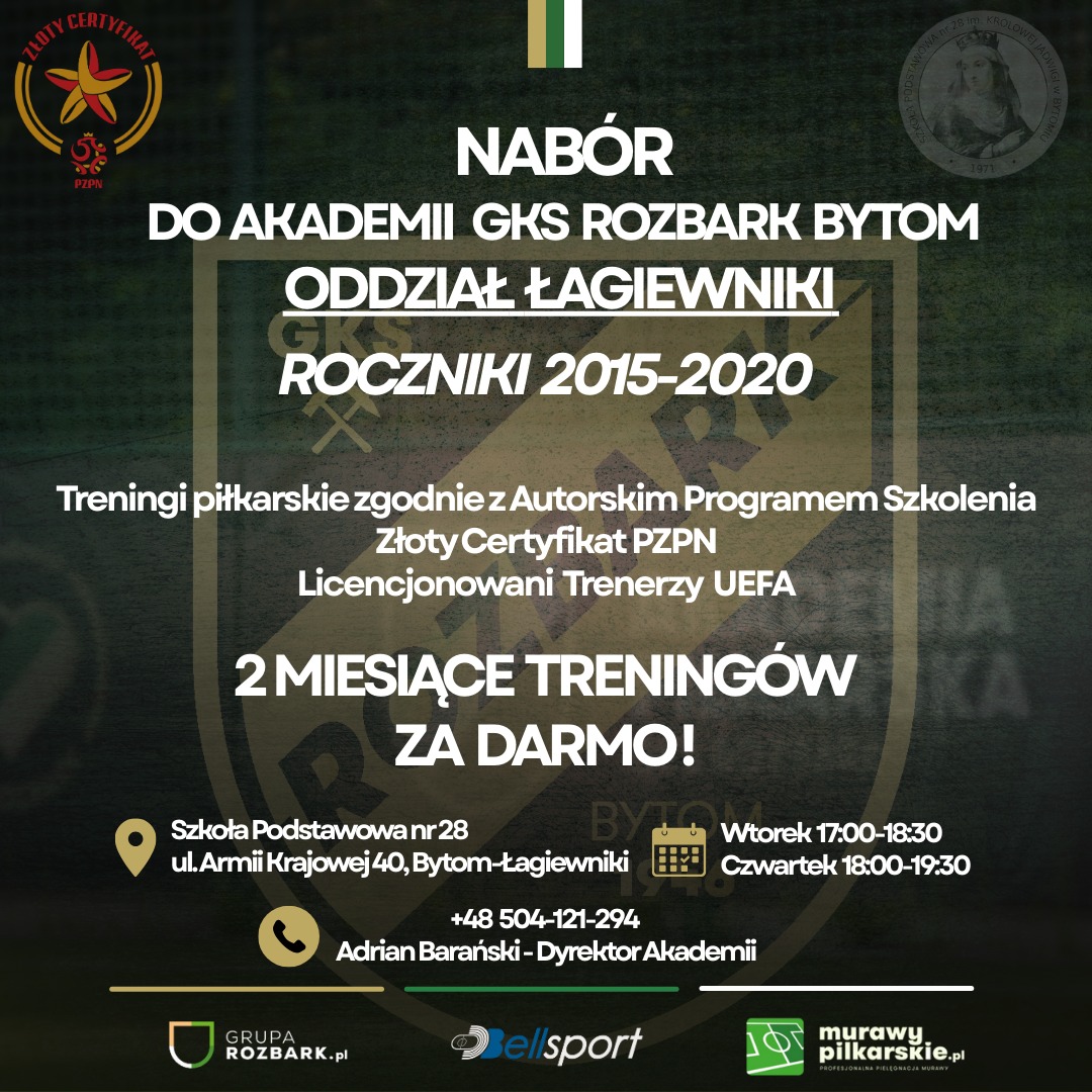 GKS Rozbark Bytom zaprasza chłopców i dziewczynki z roczników 2015–2020 do rozpoczęcia piłkarskiej przygody w swoim oddziale w Łagiewnikach. Treningi prowadzone są zgodnie z autorskim programem szkolenia, a Akademia posiada Złoty Certyfikat PZPN, co gwarantuje wysoki poziom szkolenia.