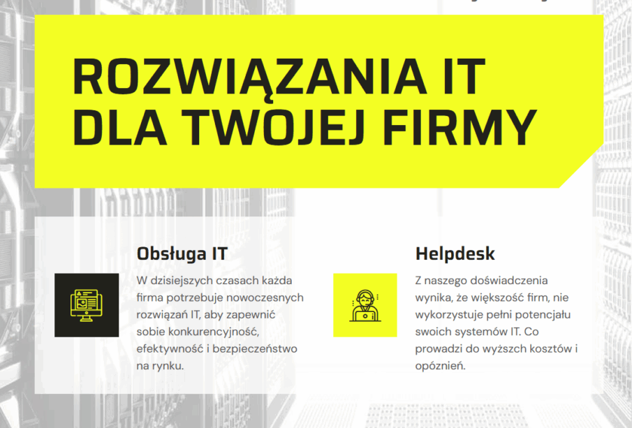 Od 2021 roku specjalizujemy się w kompleksowej obsłudze informatycznej mikro, małych i średnich przedsiębiorstw – od biur rachunkowych, przez kancelarie prawne i hotele, aż po firmy produkcyjne i usługowe. Zespół 15 specjalistów działa w trzech liniach wsparcia, co pozwala szybko reagować na zgłoszenia, minimalizować przestoje i zapewniać pełne bezpieczeństwo danych. Firma nie ogranicza się do uniwersalnych rozwiązań – każde wdrożenie i każda usługa są dopasowywane do charakteru branży i realnych potrzeb klienta. Dzięki temu przedsiębiorcy zyskują pewność, że ich systemy IT działają sprawnie, a infrastruktura jest gotowa na przyszły rozwój.