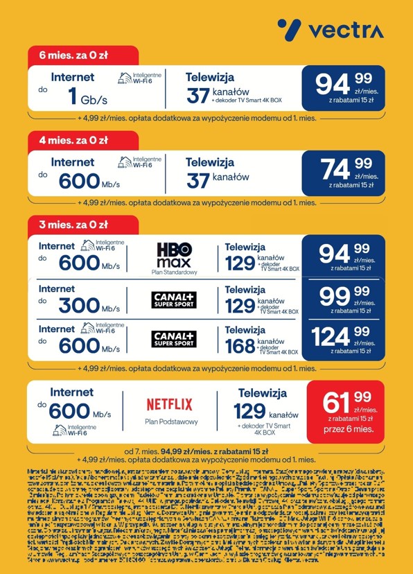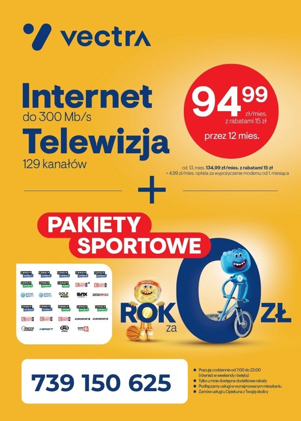 Główna promocja Vectry skierowana jest zarówno do fanów sportu, jak i osób poszukujących kompleksowej oferty w korzystnej cenie. Paczka z 23-miesięcznym okresem zobowiązania dostępna jest za 94,99 zł/mies. przez pierwsze 12 miesięcy, po czym opłata wzrasta do 134,99 zł/mies.: