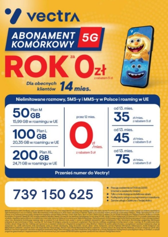 Kolejną ofertą z kampanii Vectry jest promocja na komórkę dla osób przenoszących numer. Nowi klienci, wybierający umowę z okresem zobowiązania na 23 miesiące, w tym: plan M (50 GB lub 60 GB przy zakupie online), plan L (100 GB) lub plan XL (200 GB), skorzystają z usług przez rok za 0 zł, a od 13 miesiąca zapłacą odpowiednio: 35 zł/ mies., 45 zł/ mies. i 75 zł/mies. Jeszcze korzystniejsze warunki przygotowano dla obecnych klientów Vectry, którzy przeniosą numer – w ich przypadku bezpłatny okres obejmuje aż 14 miesięcy.